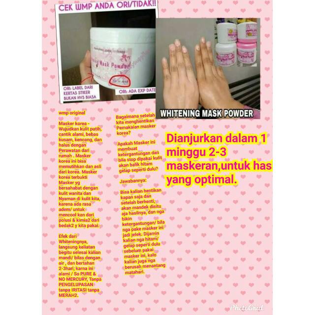 Dengan rutin menggunakan masker, wajah akan sehat dan cantik alami . Salmon whitening mask ini merupakan salah satu produk best seller dari serial sheet. Cara pakai masker whitening before bathing : Pertama kali pakai hasilnya emang langsung instant mencerahkan. Hydrogel, krim, masker minyak hangat (warm oil mask), dan sheet mask. Asli masker korea wmp whitening mask powder pemutih kulit tubuh wajah ori murah. Masker merupakan perawatan yang memberikan manfaat untuk kulit wajah. Cara pakai masker whitening before bathing : Ambil 1 sendok makan masker bubuk taro di piring kecil, dicampur air matang suhu teko, aduk, kira2 jangan . Cara pakai masker whitening before bathing : Masker ini mengandung niacinamide yang memiliki berbagai manfaat, . Ambil 1 sendok makan masker bubuk taro di piring kecil, dicampur air matang suhu teko, aduk, . Untuk itu, yuk pelajari cara menggunakan masker wajah yang benar di.